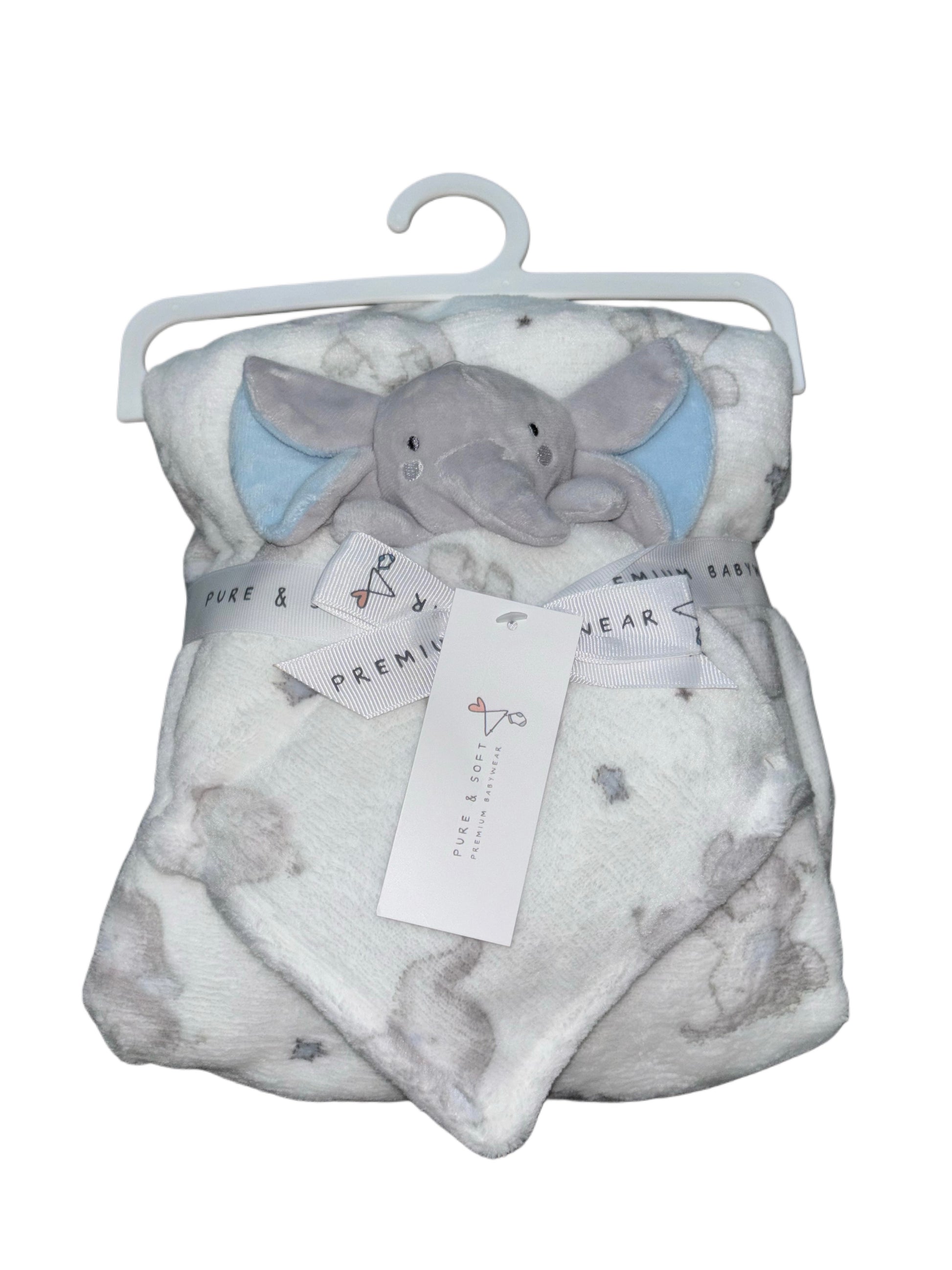 Soft blanket with matching elephant comforter, perfect gift for a new arrival.